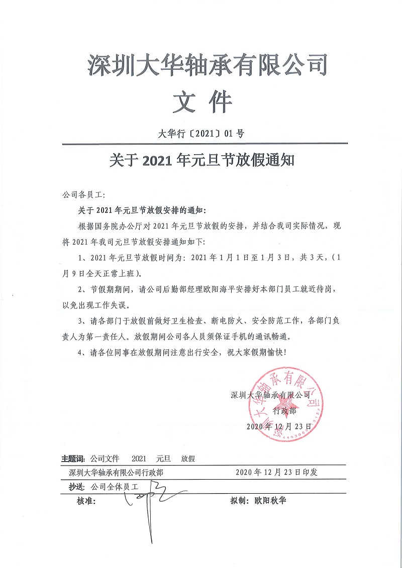 深圳大華軸承有限公司2021年元旦節(jié)放假通知